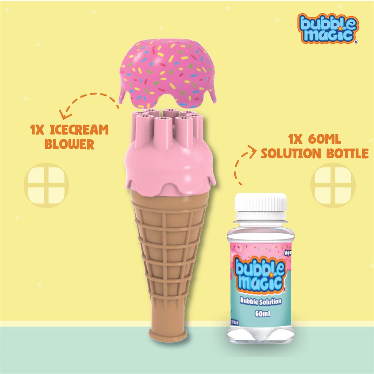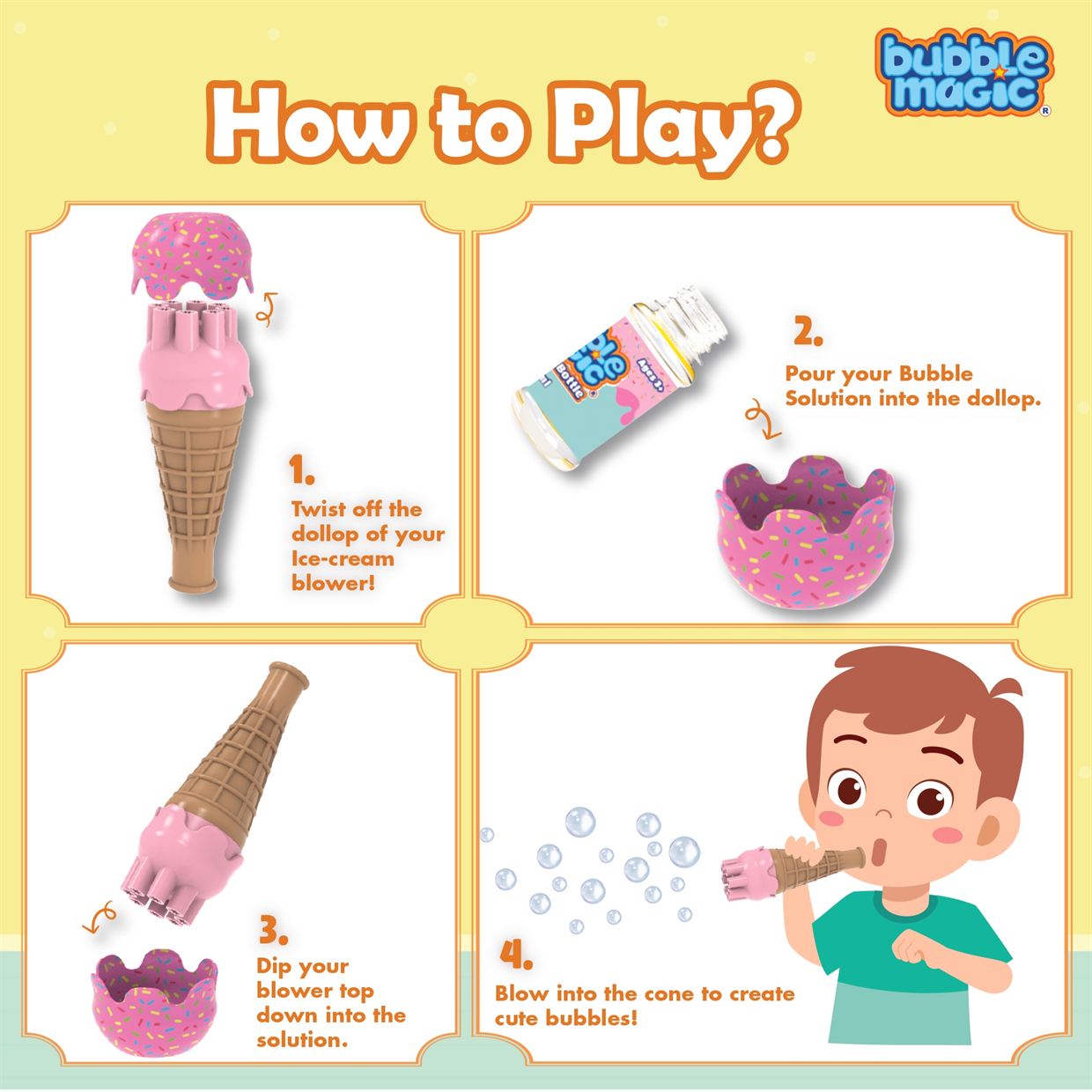 Dip, Blow and Play: Playing with Bubbles just got a lot more fun! Just dip the Ice Cream Blower face down into the solution and blow through the cone to make enchanting bubbles! |