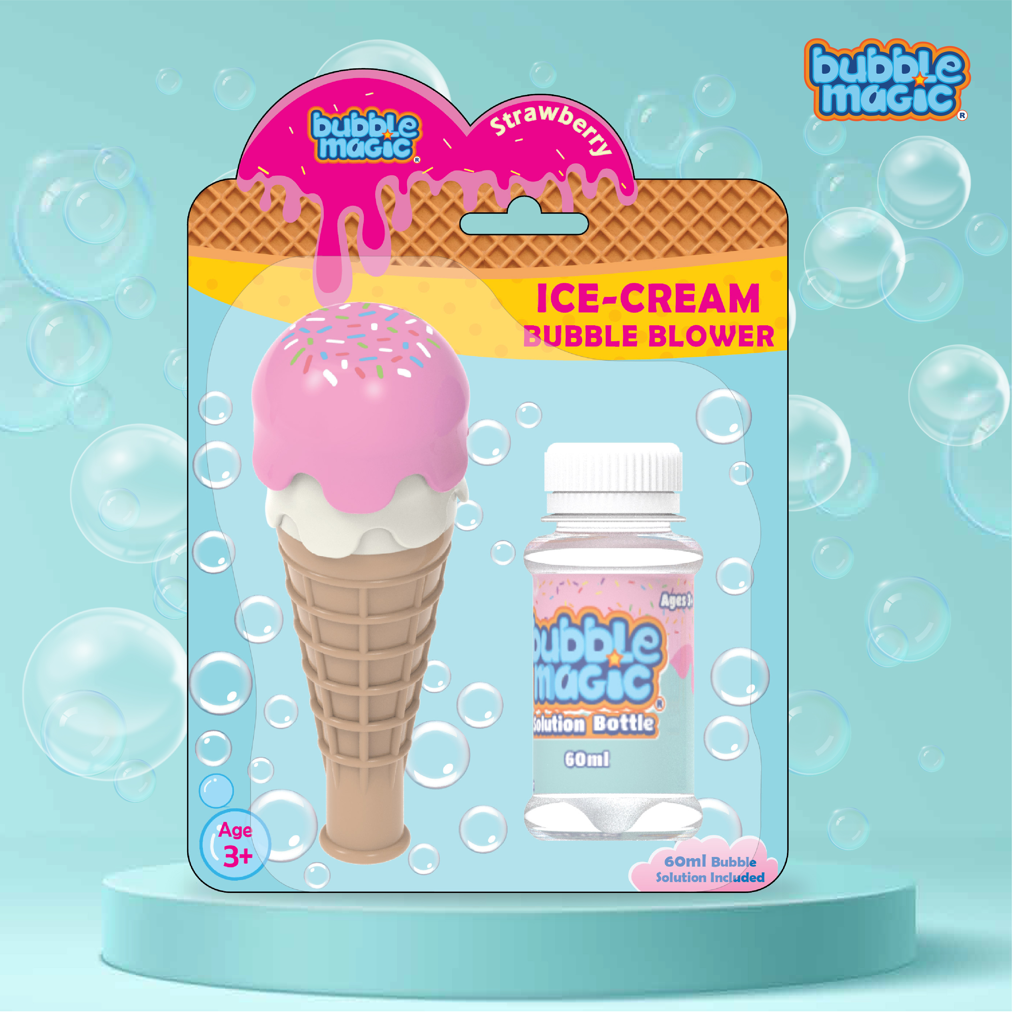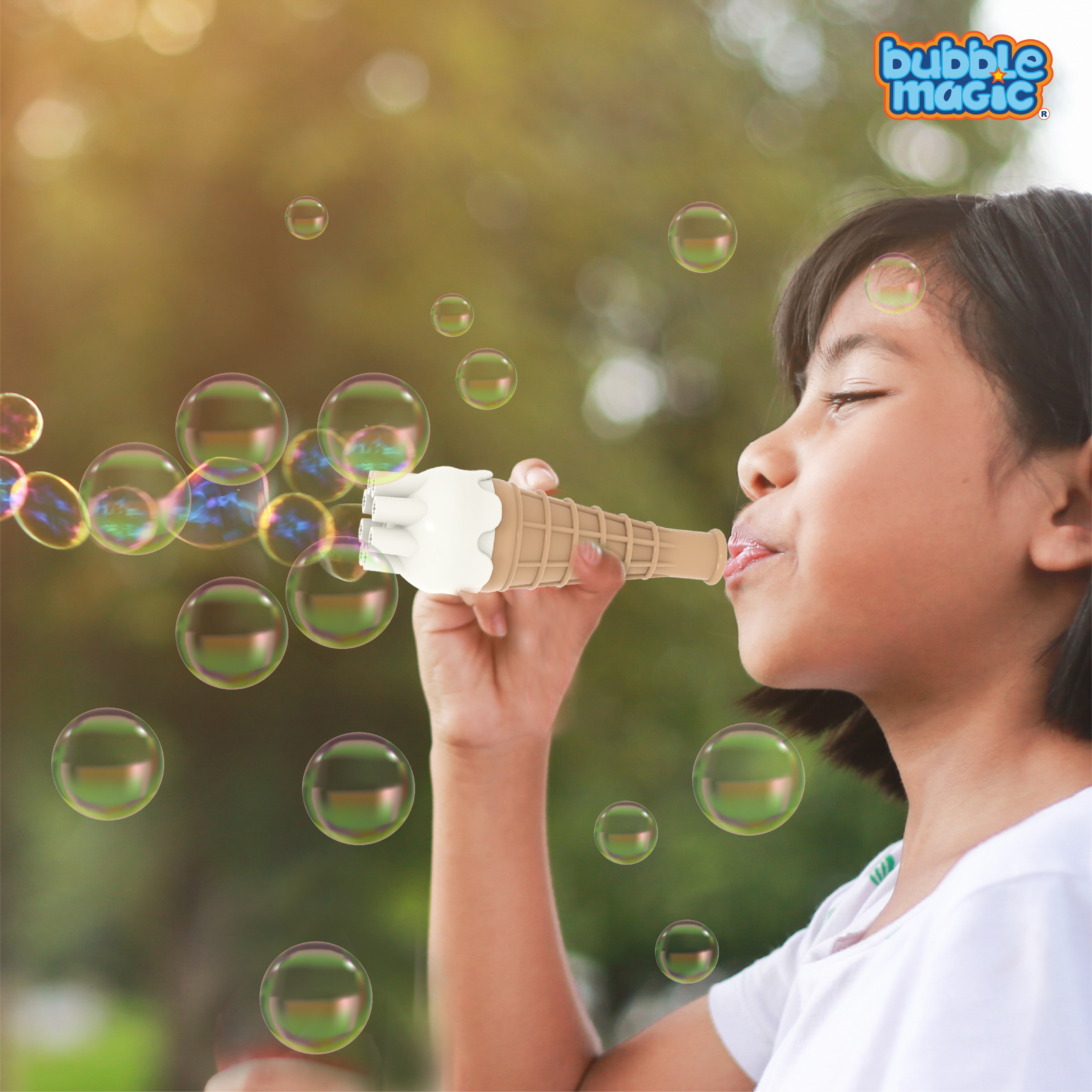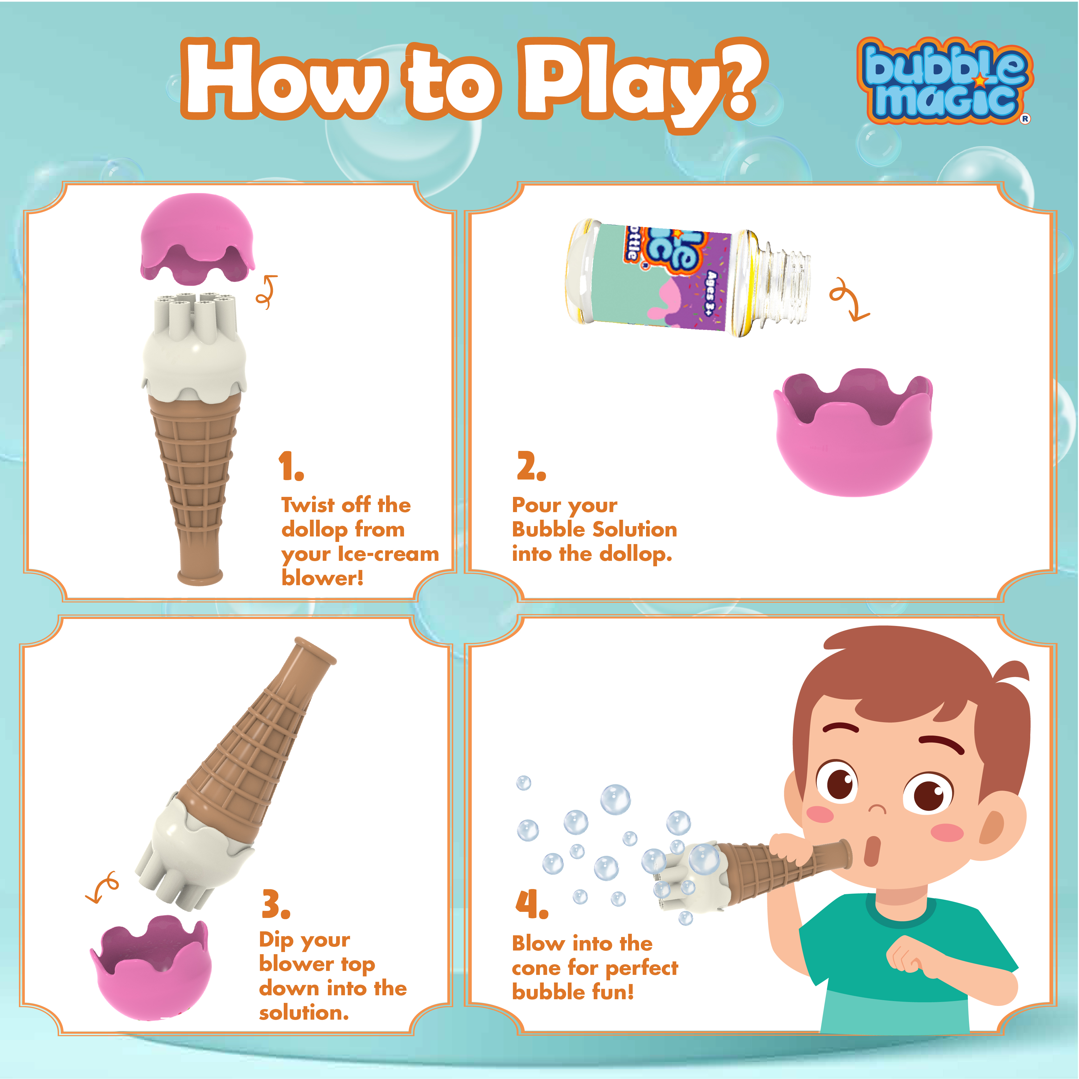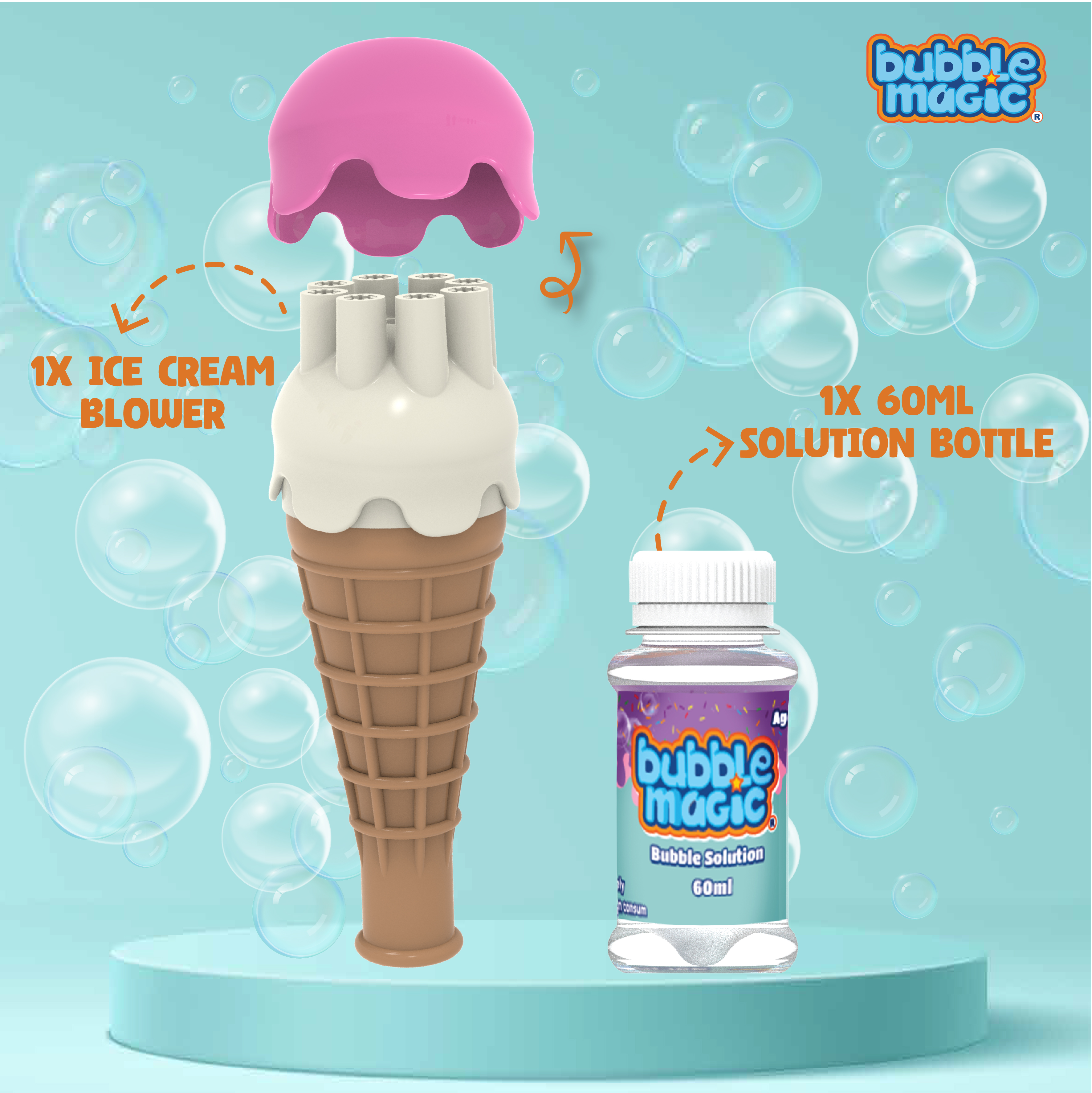 Dip, Blow and Play: Playing with Bubbles just got a lot more fun! Just dip the Ice Cream Blower face down into the solution and blow through the cone to make enchanting bubbles! |