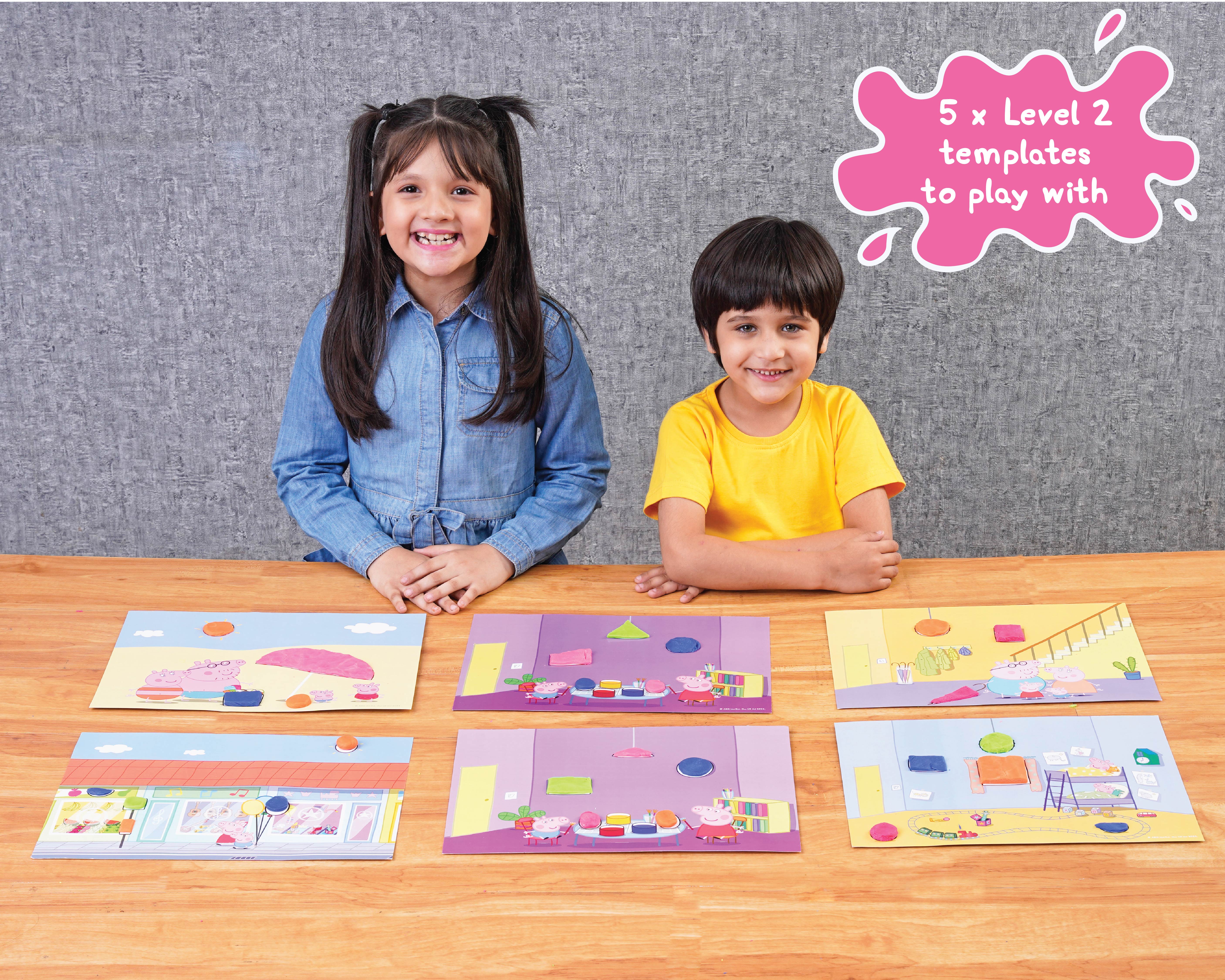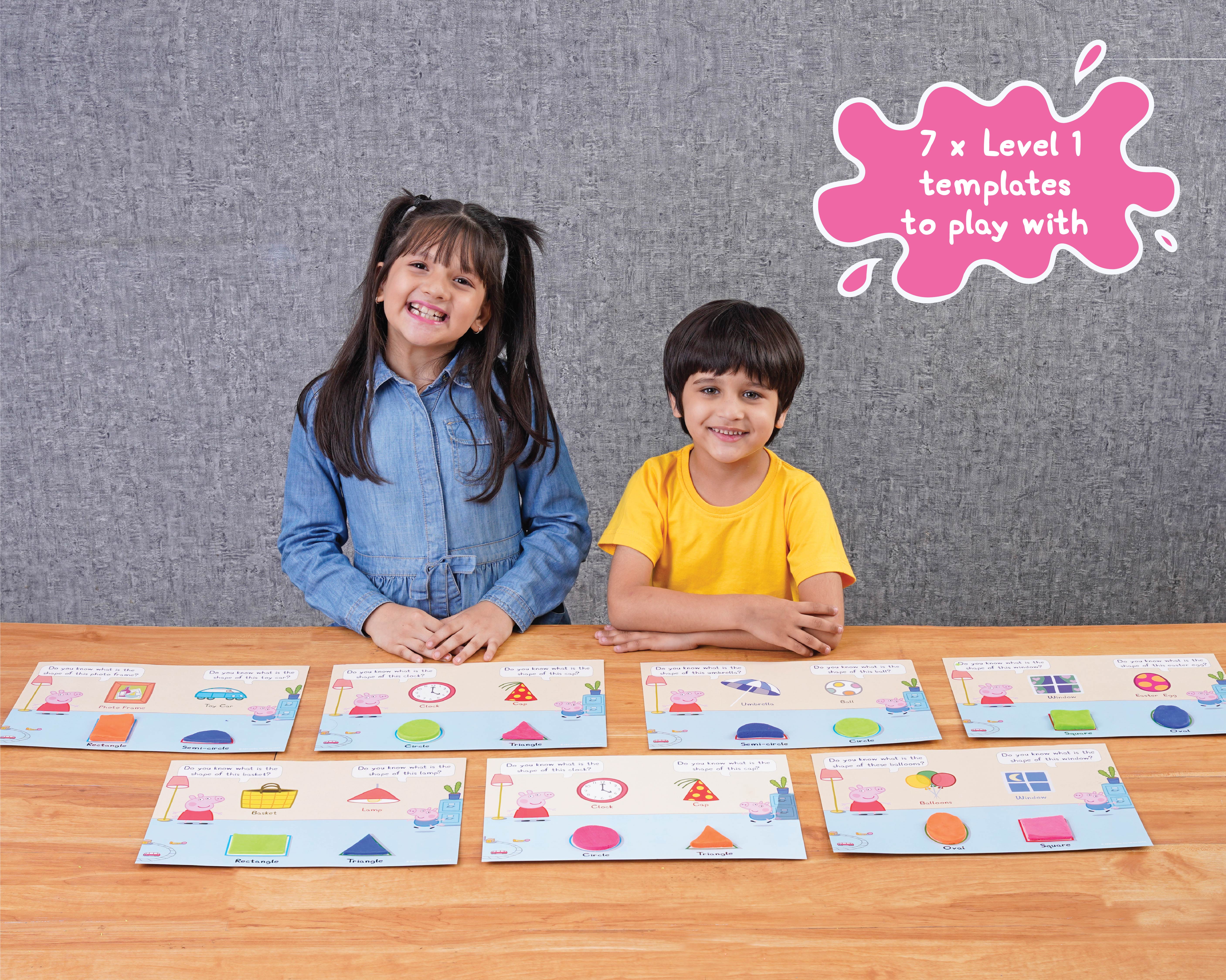 Learn to Identify & Mould shape that Peppa Pig is asking, cut through super soft dough using 6 different shape cutters and place them on the level 1 templates. For the level 2 template cards, identify the missing shapes on the templates and freehand mould and cut the dough to fill the shape. |
