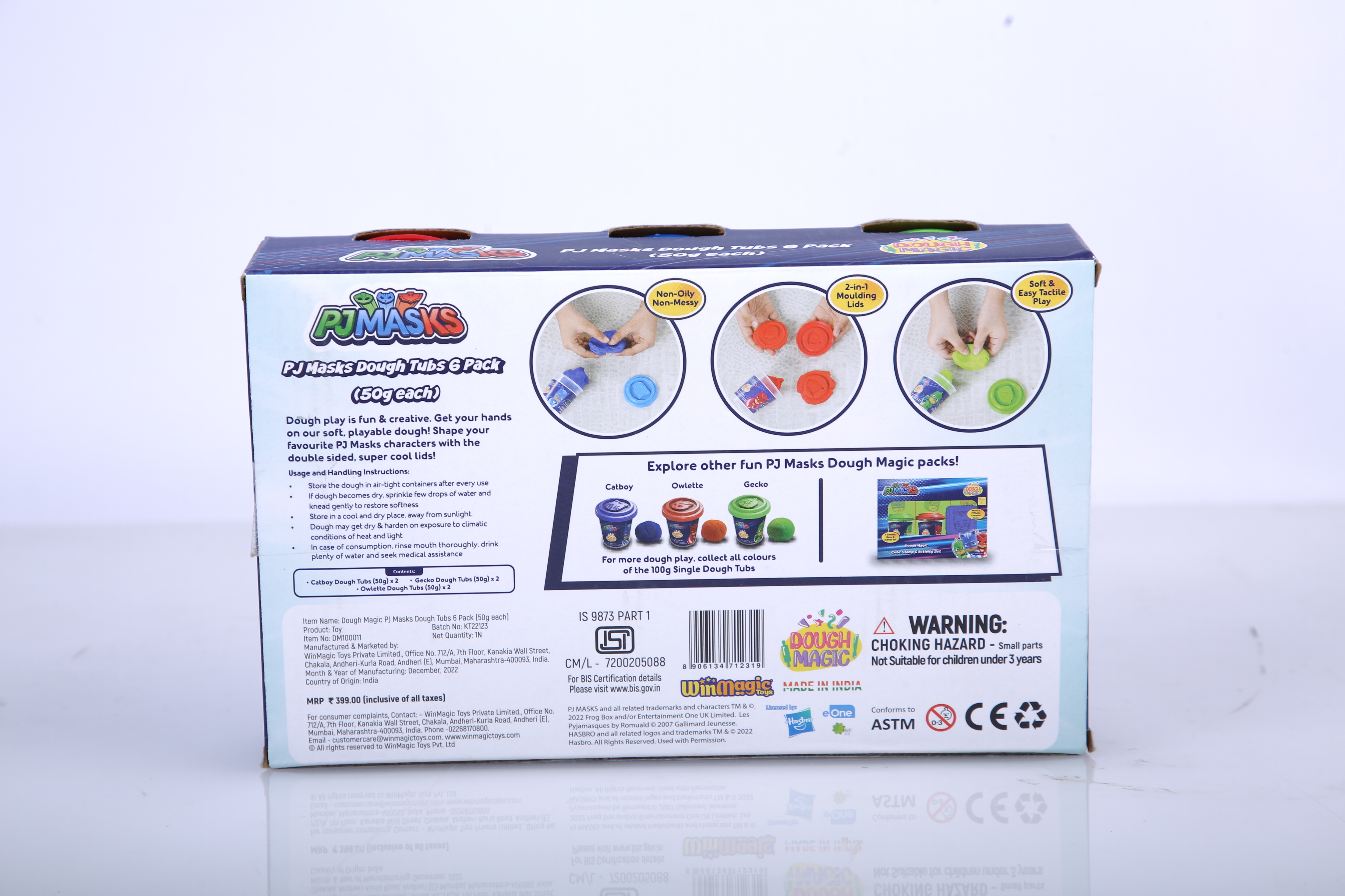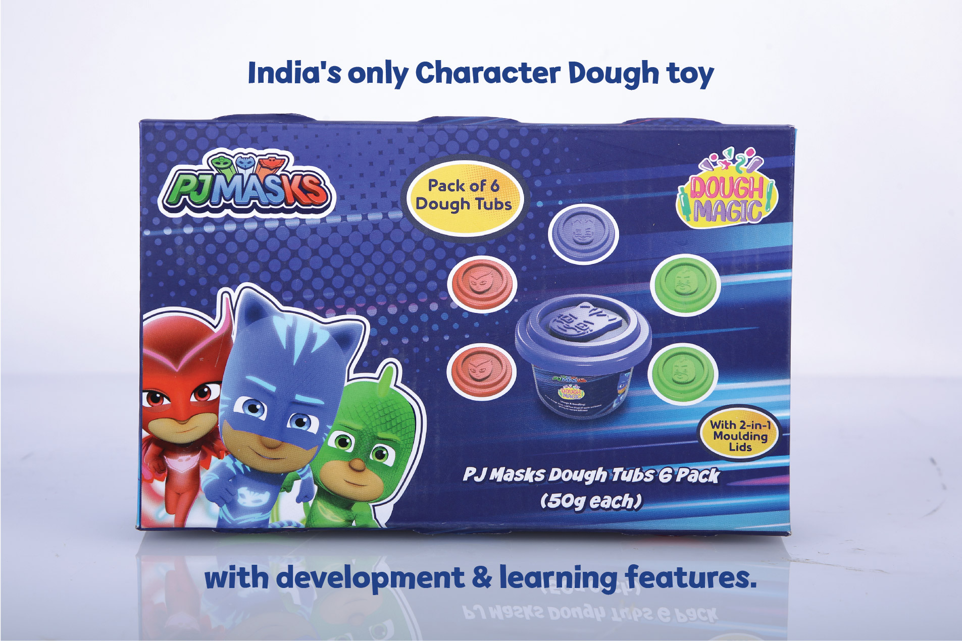 An assortment of 6 PJ Masks dough tubs of 50 g each. Comes In The Assortment of 2 Catboy Tubs, 2 Owelette Tubs & 2 Gecko Tubs |