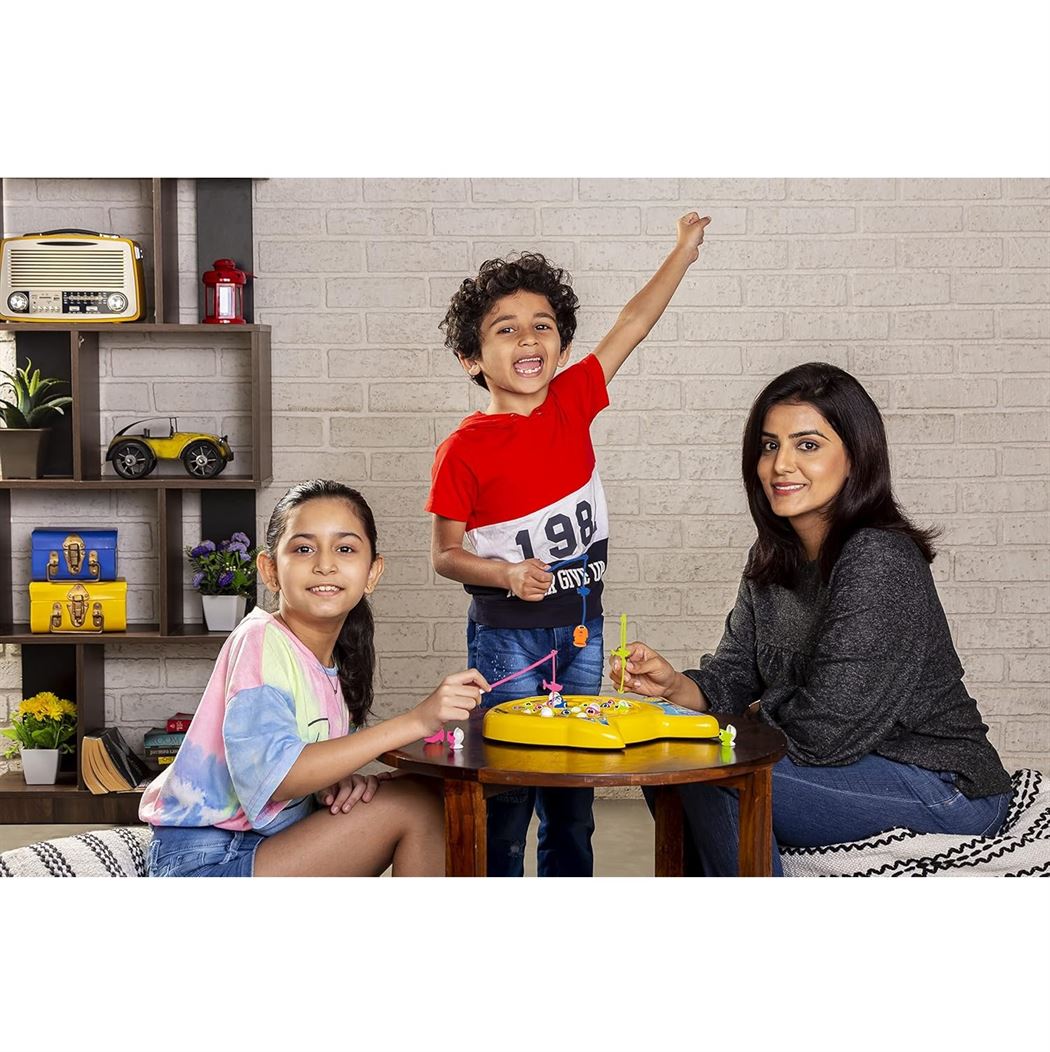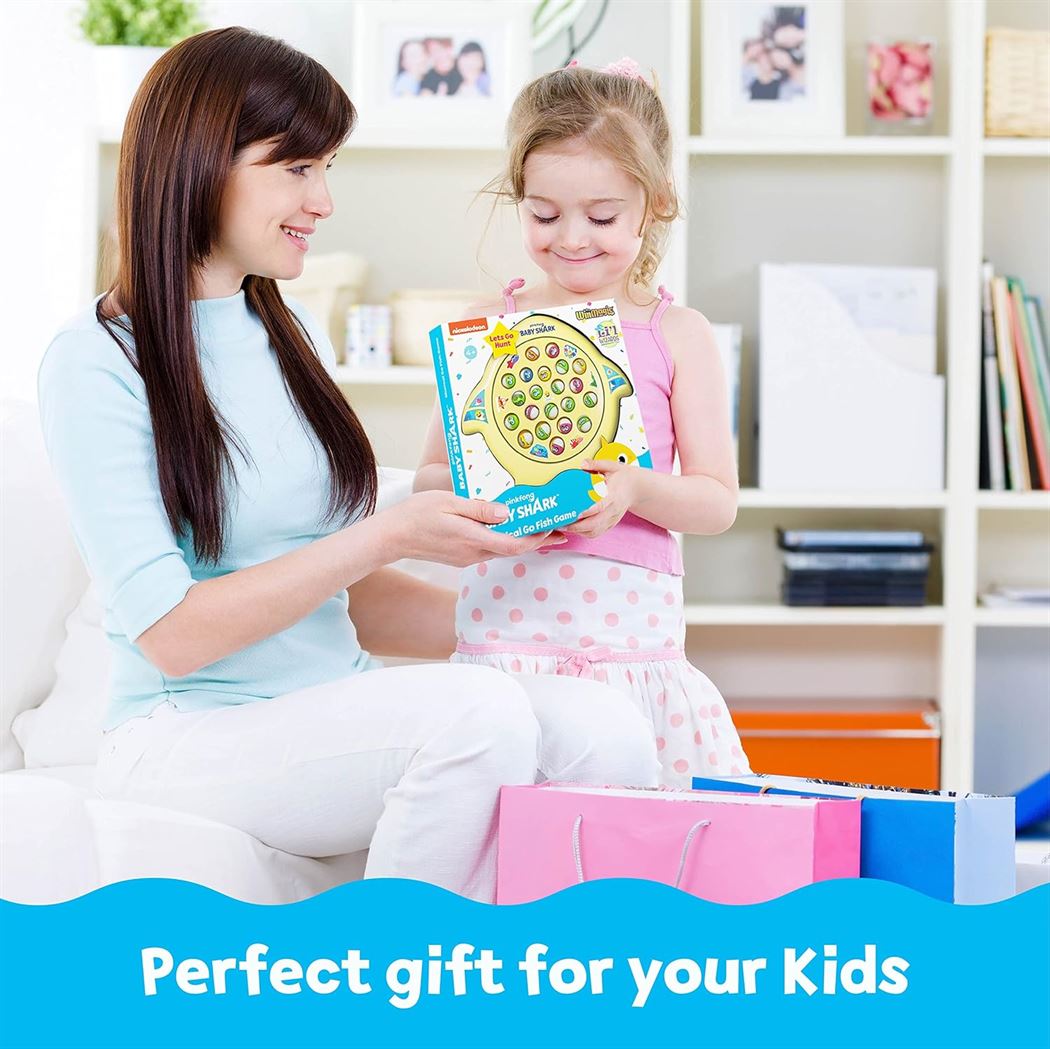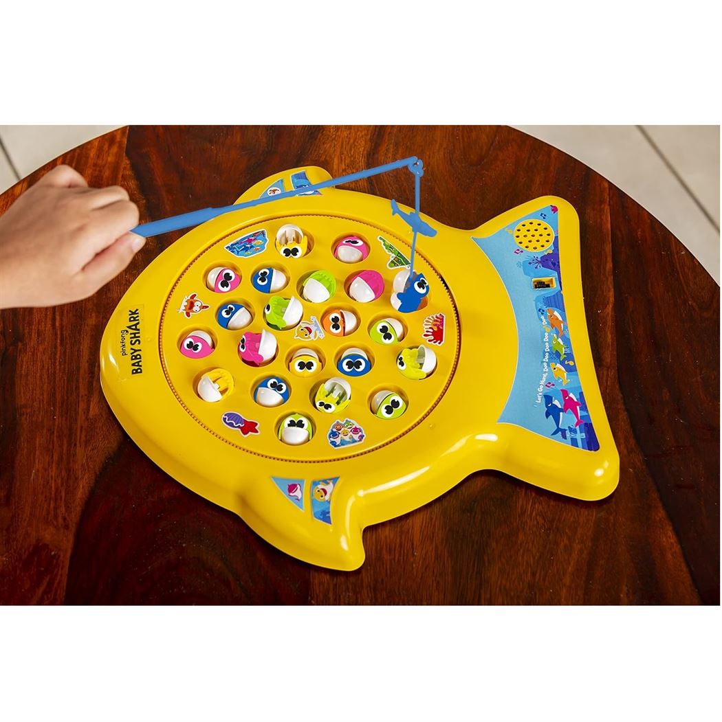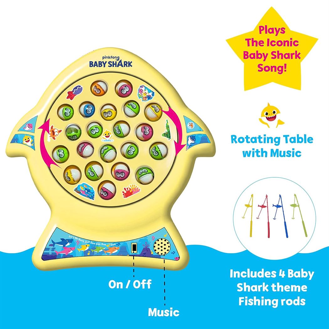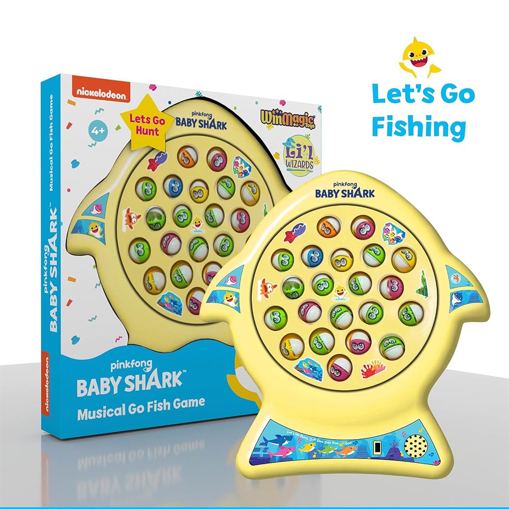 Features stickers of adorable characters from Baby Shark. And fishing rods with 4 members of shark family i.e., Baby, Mommy, Daddy and Grandpa shark |