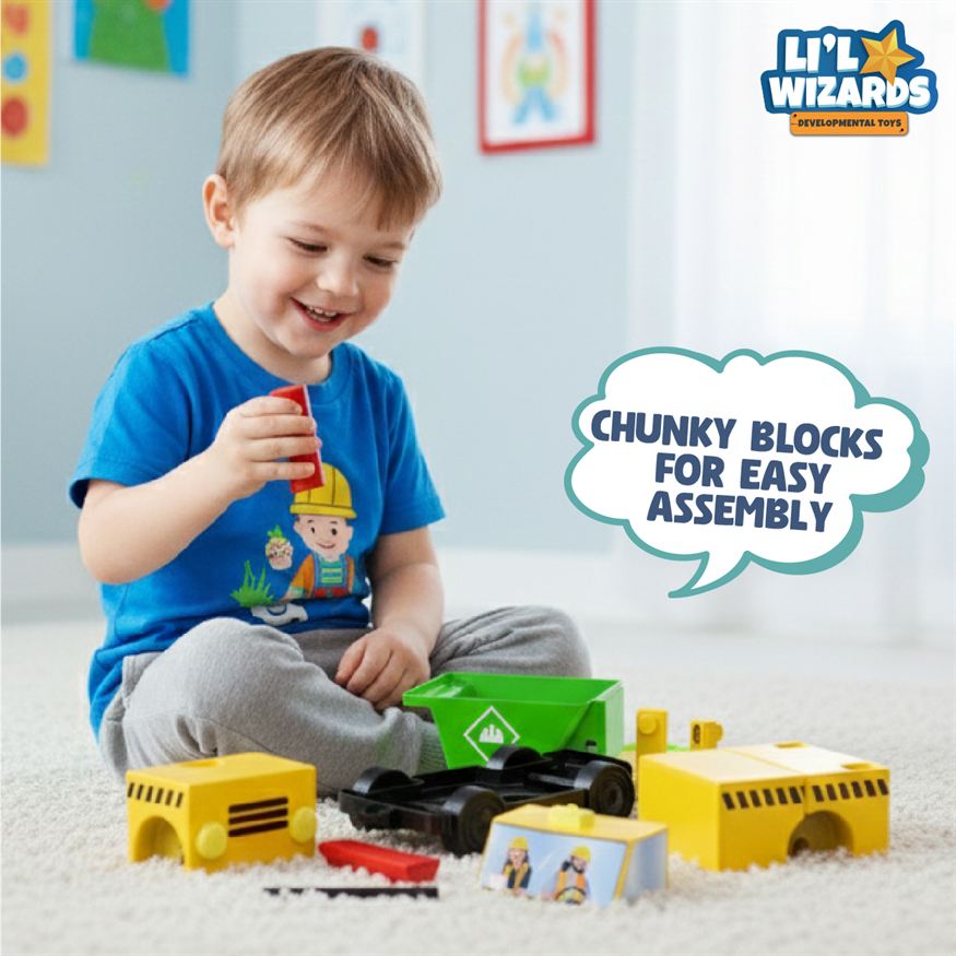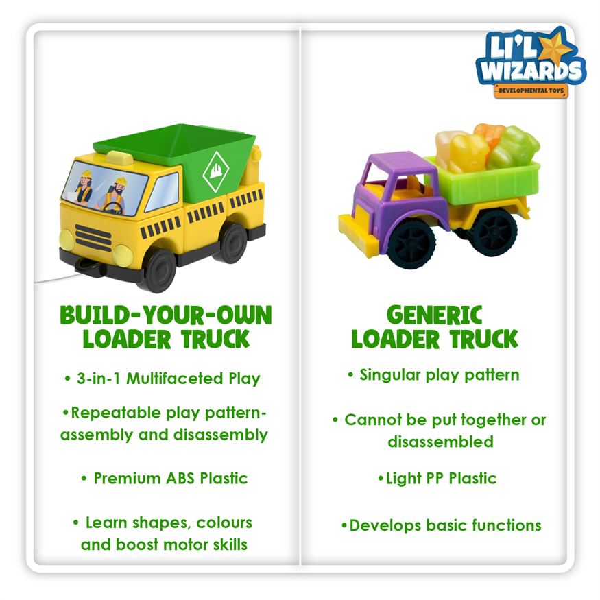 The Li'l Wizards Build Your Own Loader Truck is a multifunctional Build, Stack & Play educational toy designed to introduce kids to early engineering and construction concepts.