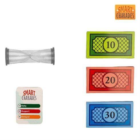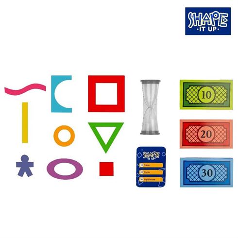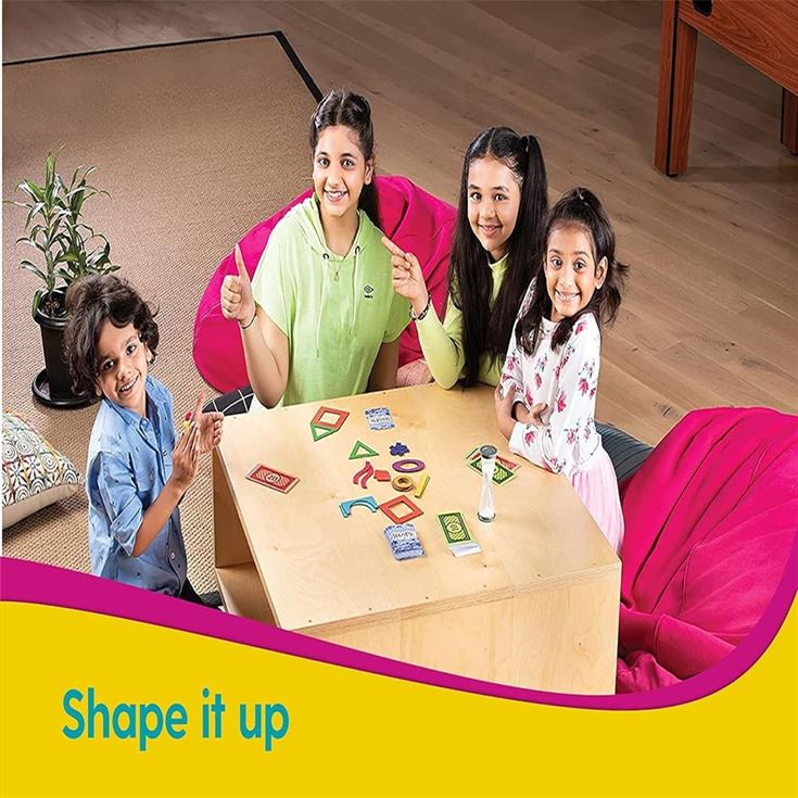 SHAPE - IT UP : Form teams Team on their turn, nominates one player to create shapes using given 2D shapes Nominated picks a shape card & creates one of the 3 clues. If the team guesses the clue correctly within 60 secs, they earn points as per the difficulty level of the clue Team can select more clues to shape up and score big within their limit of 60 secs. .... :: Contents: 1 x Game Guide 40 x Cards 20 x Custom Shapes 60 x Currency Notes 1 x Timer |
