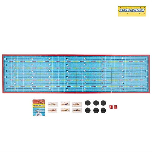 RACE-A-THONE : Arrange the board swim or race side up Place athlete tokens as per the race Player on their turn rolls 2 dice – one moves their pawn, other moves opponents' pawns Win Bonus cards and add twists to the game Player to reach the finish line first wins! ... :: Contents: 1x Game Guide 4x Racetracks 2x Dice 20x Bonus Cards 12x Player Pawns |