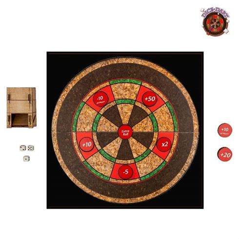 DICE DART : Place scoring tiles on the Dart board randomly. Player on their turn, roll 3 dice one after the another into the dice tower. Points are awarded to the dice on board, dice outside the board earns no point. ... :: Contents: 1 x Game Guide 1 x 15” Game Board 3 x Dice 1 x Dice Tower 20 x Score Tokens |