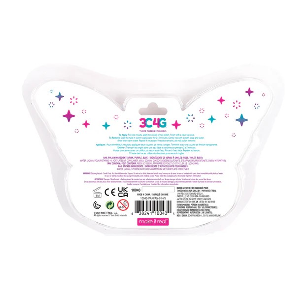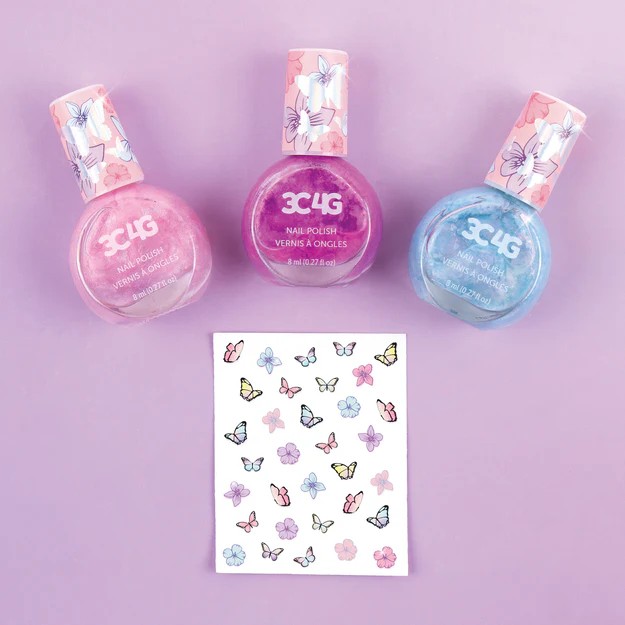 Master at-home manicures with these shimmering nail polish colors and butterfly nail stickers. These 3 glossy polishes are made to mix and match, whether your fashionista sticks to a modern monochrome or paints each nail a different color, the finished look will always be trendy. These high-shine pigments last through playtime and come off simply with nail polish remover to make changing it up easy-peasy. Safe to use, fun to wear, win-win. Whether it’s a birthday bash, playdate or slumber party, these shimmering colors and cute nail stickers offer up the perfect playtime activity for little ones to explore their fun, creative sides. Polish is water-based, comes in 3 8mL glass bottles and is tested for use by children. PERFECT FOR AGE 8+