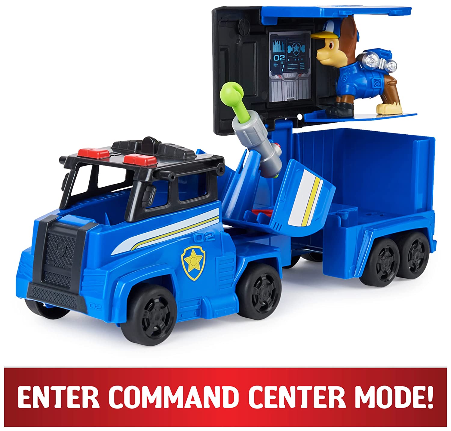TRANSFORMING TOY TRUCKS: Chase’s Big Rig truck quickly transforms into Command Center mode! Simply pop up the trailer roof and raise the satellite dish to reveal the 2-story Command Center! |
