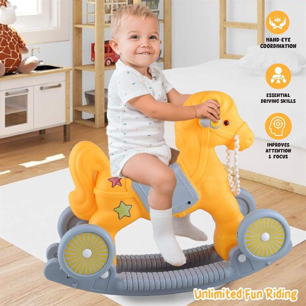 PlayMagic 2-in-1 Rockin' Roll Horse is a delightful addition to your kid's playroom! This versatile toy combines the classic charm of a rocking horse with the exciting mobility of a wheeled ride-on, offering double the fun and double the excitement!