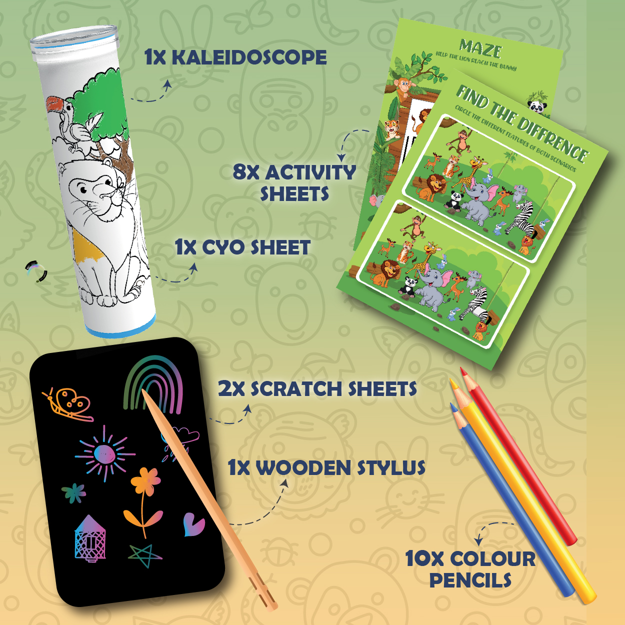 8x activity sheets1x Kaleidoscope2x scratch sheets2x wooden stylus1x CYO sleeve10x colour pencils |