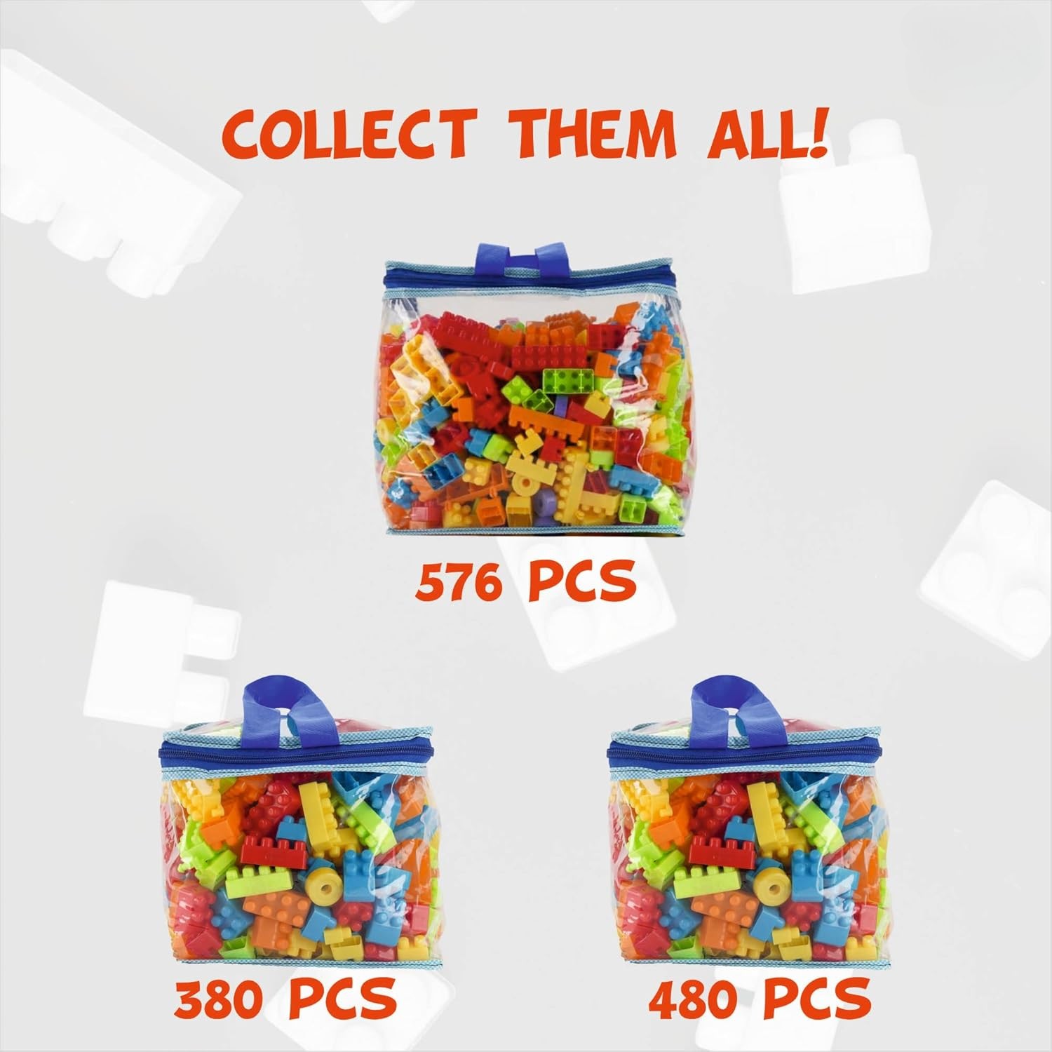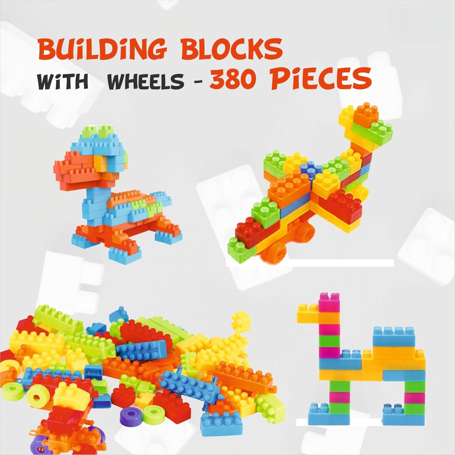 380 Pieces Set: Contains a versatile mix of colorful blocks, wheels, and connectors. |