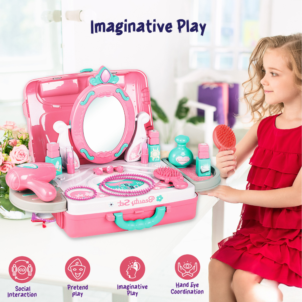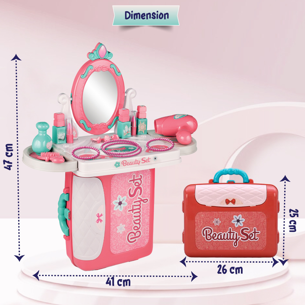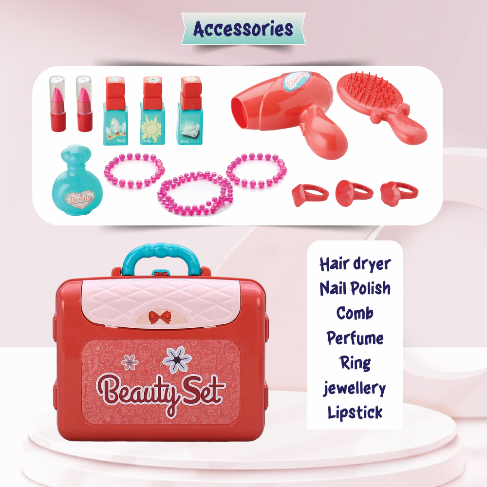 Complete Beauty Set: Includes pretend beauty essentials like a hairdryer, brush, mirror, and makeup accessories for creative dress-up and role-playing. |