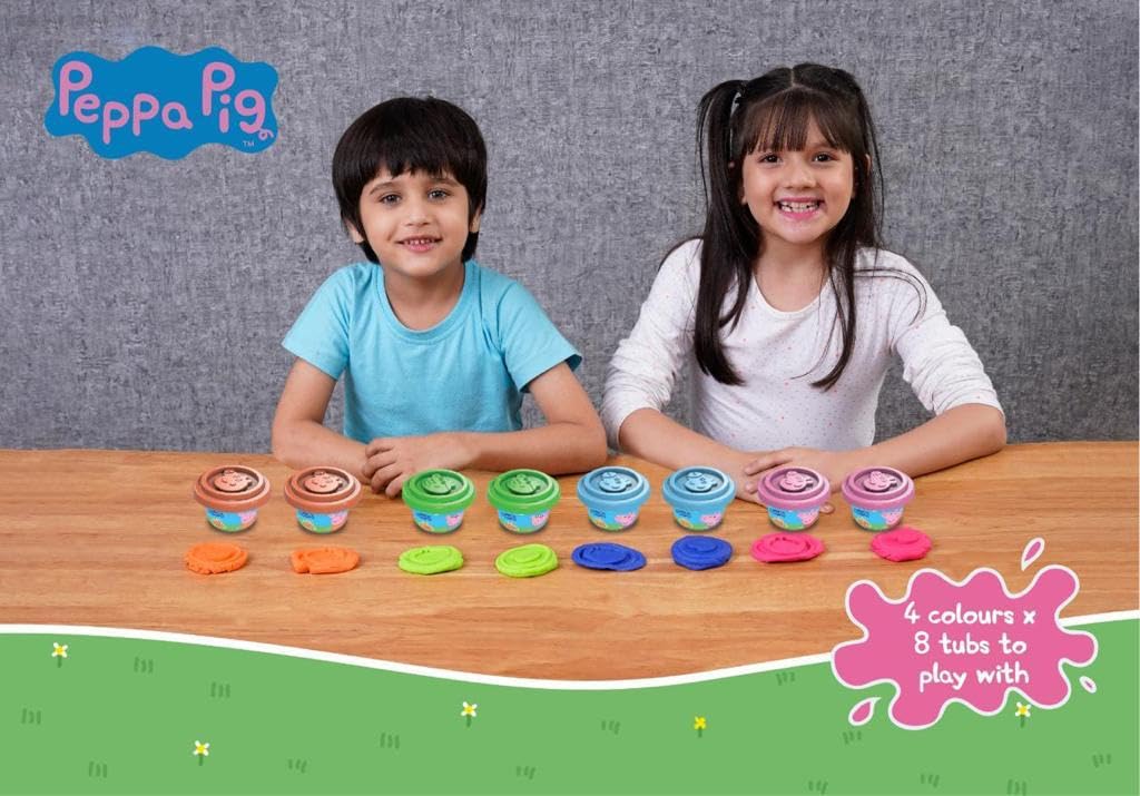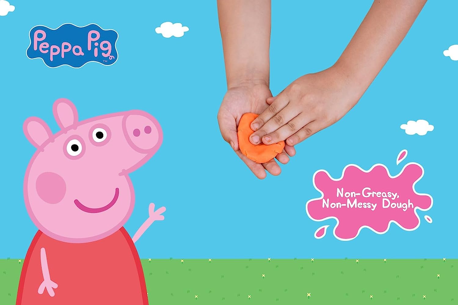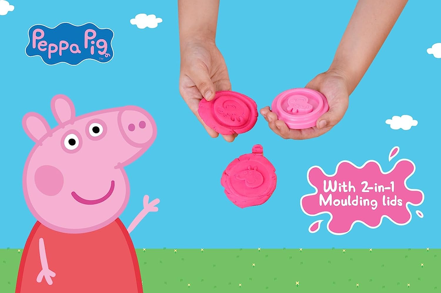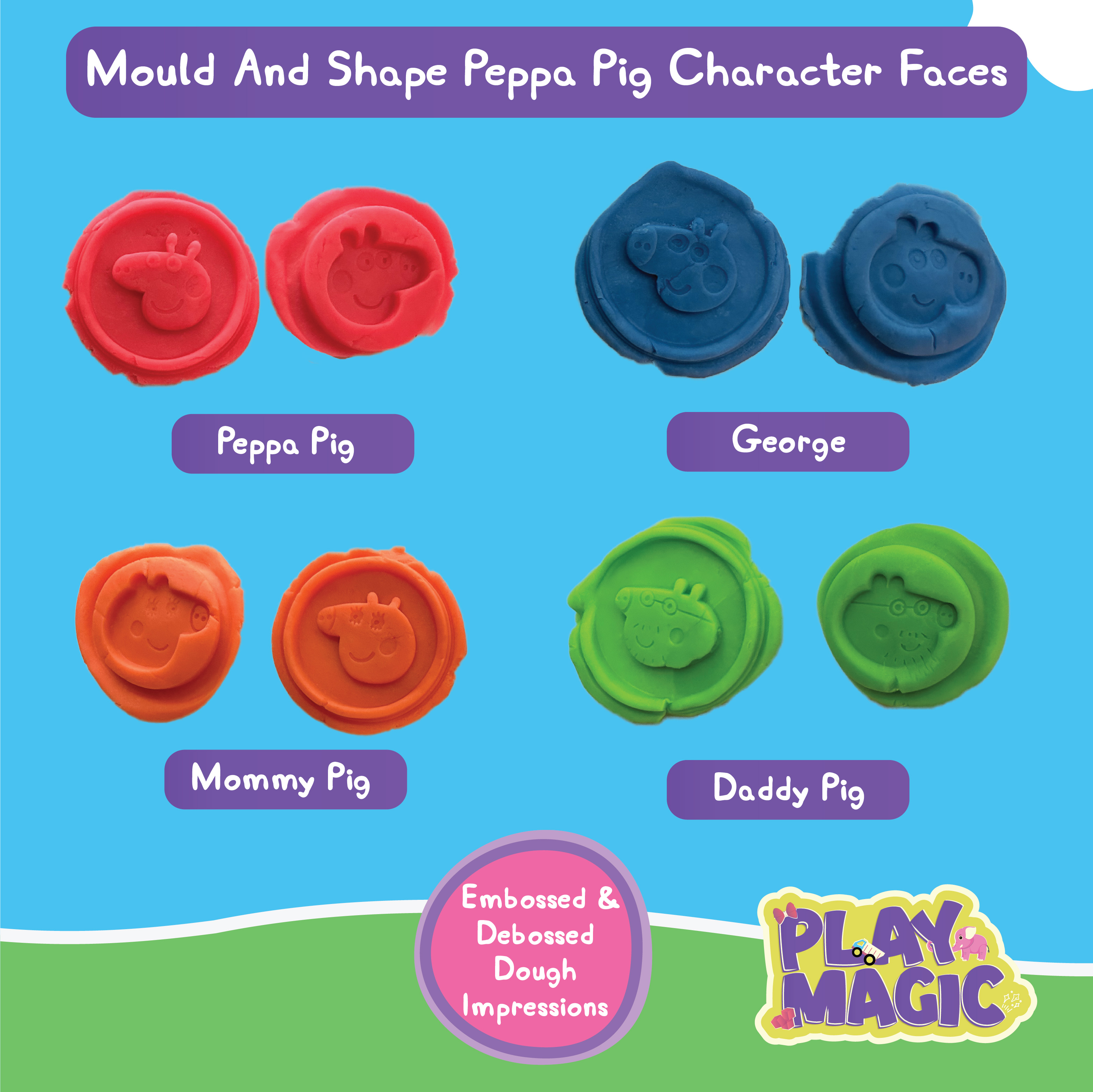 Mould 4 Peppa Pig character faces using the 2-in-1 moulded lids of the tubs. Get embossed and debossed dough impressions each in a different colour! |