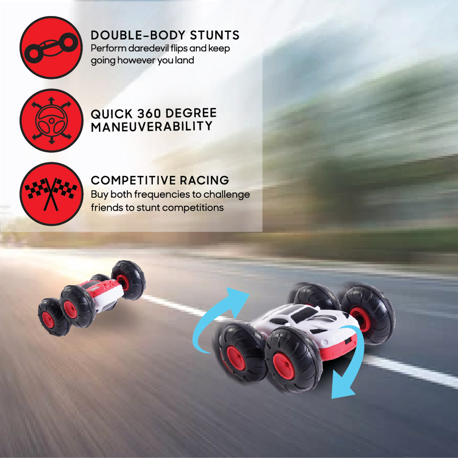 Effortlessly perform gravity-defying stunts: maneuver this double-sided vehicle outside or around your house and watch this mighty RC stunt car tear around corners. Then flip it over and keep going! Whether you flip the car or jump ramps, the Flip stunt Rally car brings a thrilling experience! |