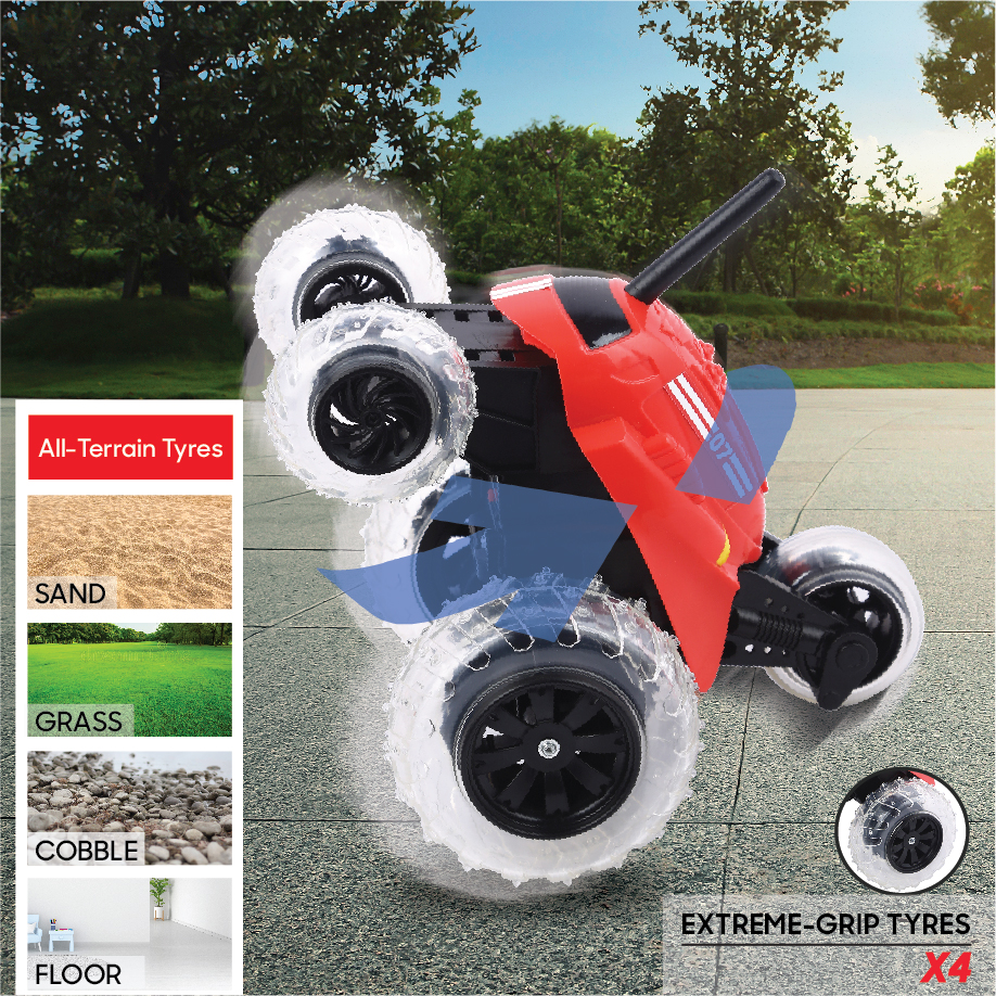 โ DUAL JOYSTICK CONTROL: The unique dual joystick remote features left and right control. Each joystick independently operates the left or right side of the car at turbo speed, making it easier to flip and spin! |